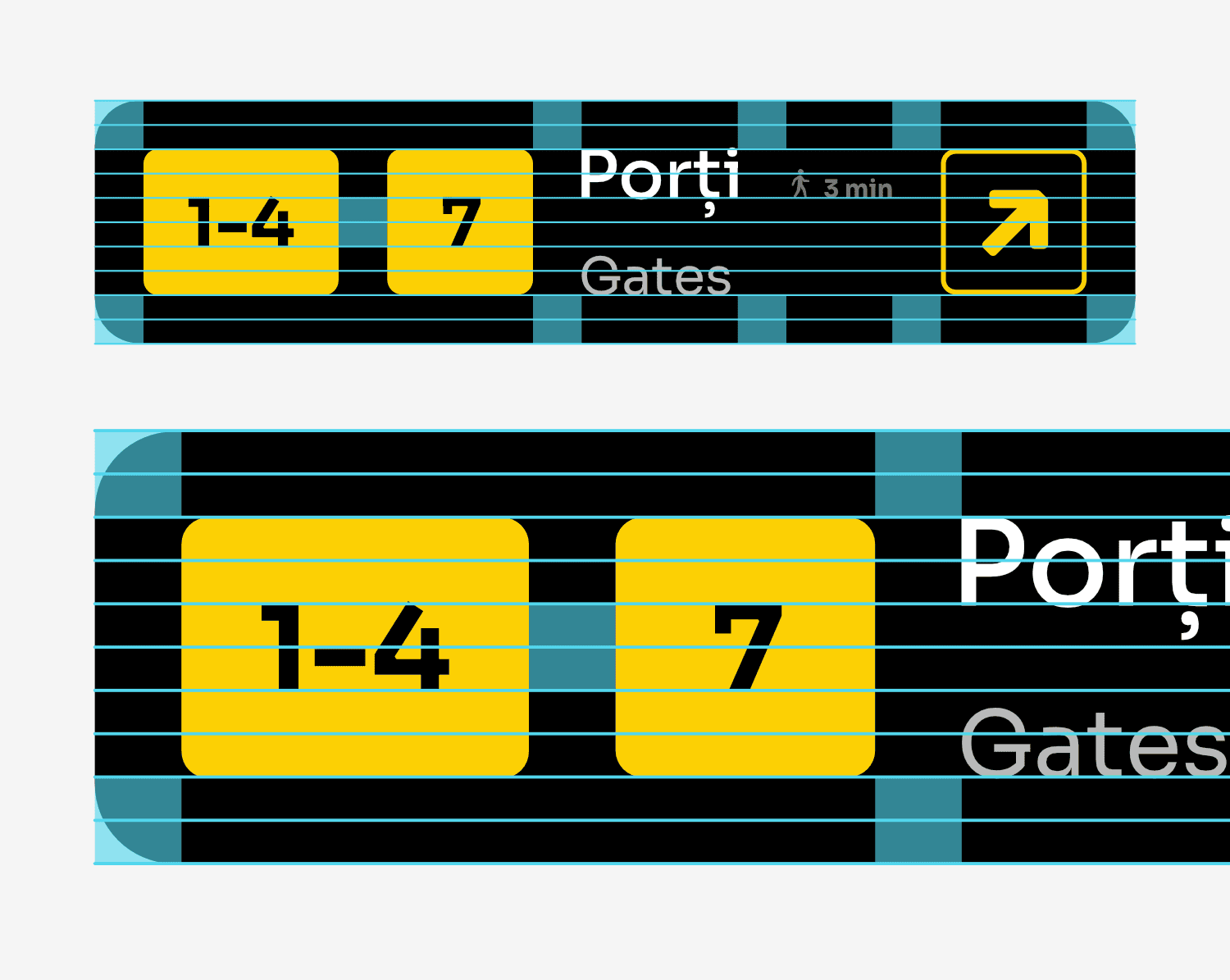 În această secțiune sunt prezentate câteva exemple de design pentru semnalizările din aeroport. Spațierile consecvente, folosirea culorilor pentru ierarhizarea informației și a separatoarelor sunt elemente esențiale pentru lizibilitate și o experiență facilă a călătorilor.